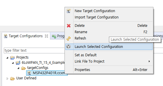 이를 위해 먼저 Target Configurations 창을 켜서 MSP432P401R.ccxml을 오른쪽 클릭해 Launch Selected Configuration을 누른다.
