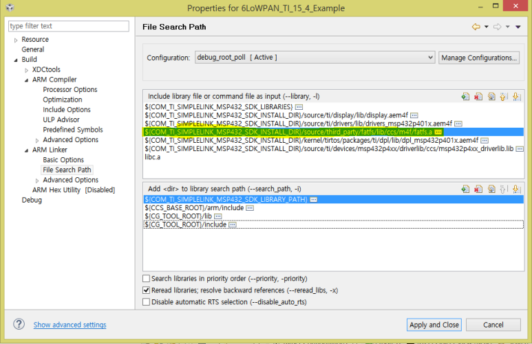 project > properties > ARM Linker > File Search Path 에서 다음과 같이 아래 사진에 highlighting된 부분의 library 경로를 위의 파일 주소 같이 바꿔준다.