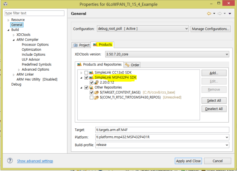 4. 위에서 Products를 눌러서 MSP432 SDK를 체크해준다.