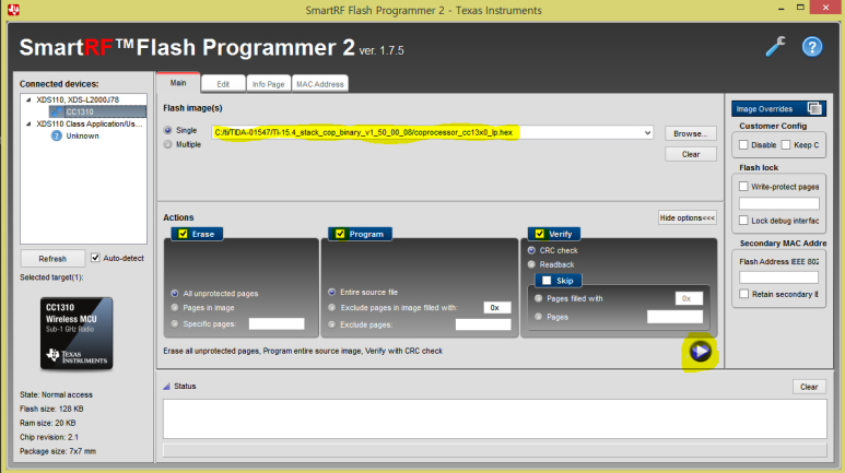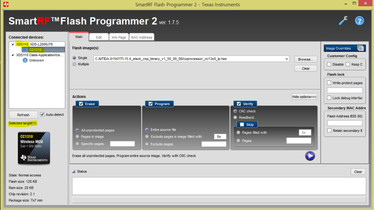 2. 그리고 SmartRF Flash Programmar 2를 열면 Connected devices 측에 연결된 CC1310이 뜬다.